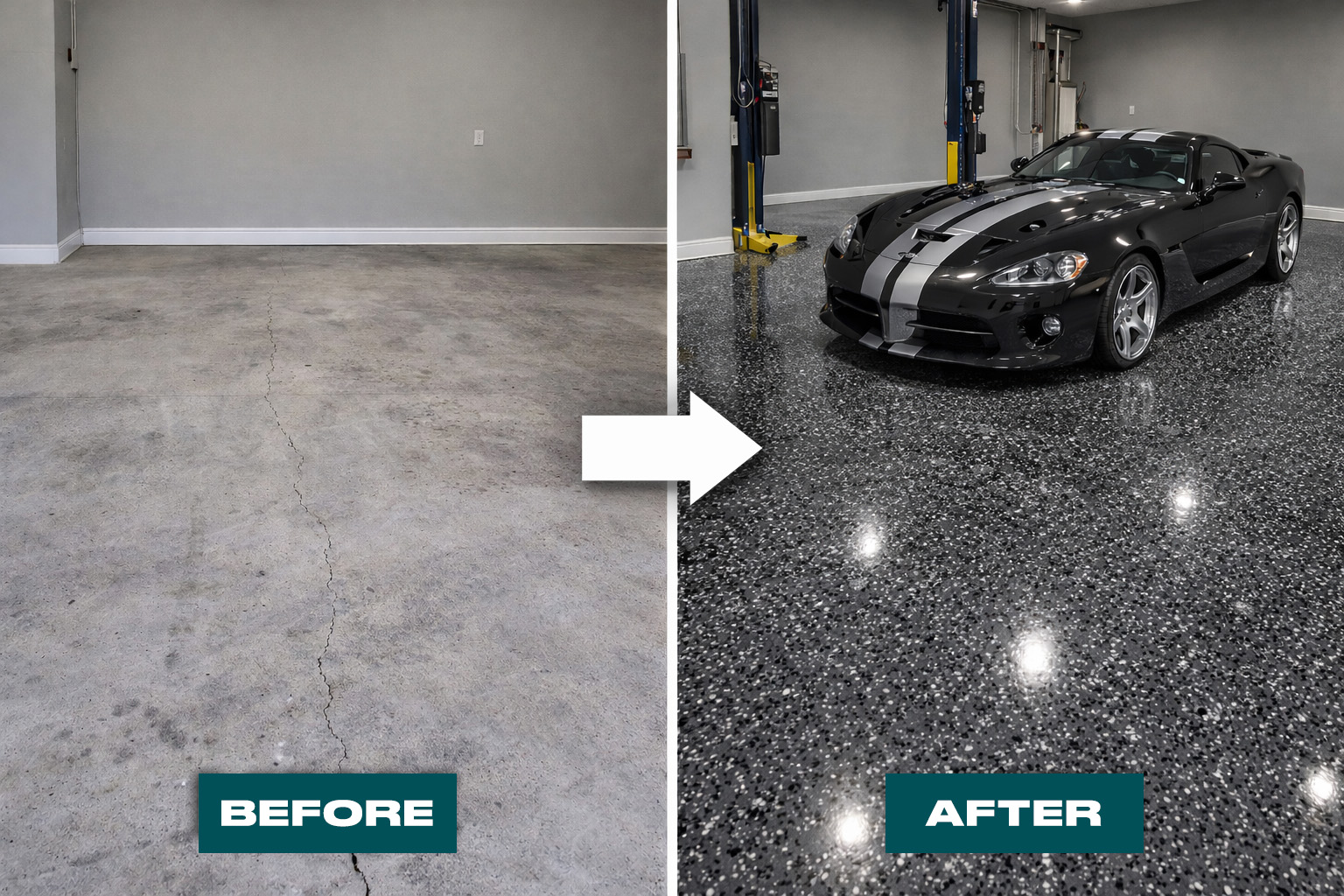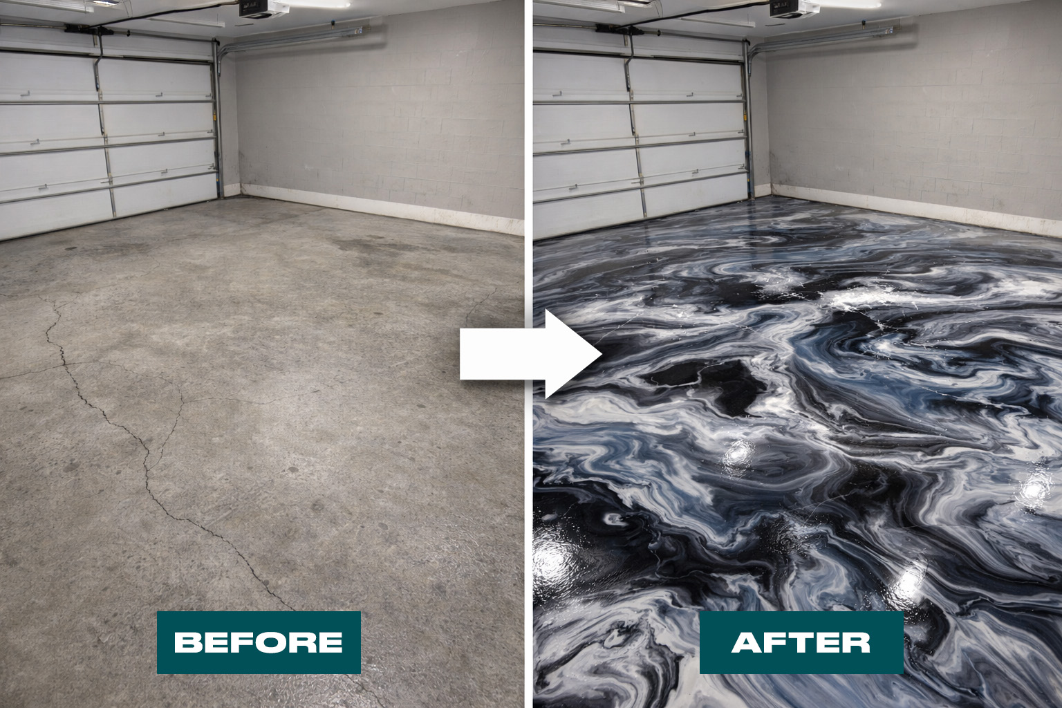 Before and after of a garage that was refinished with a custom metallic epoxy finish utilizing the customers favorite blue color as an underhue.